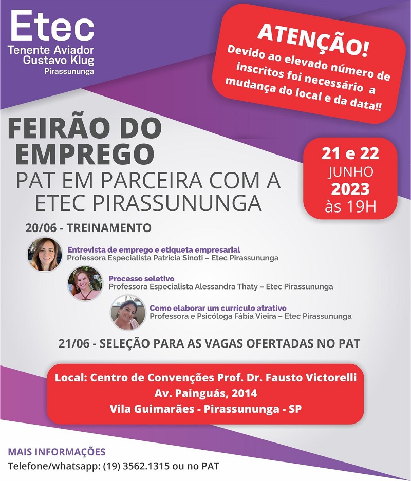 Nos próximos dias 21 e 22 de junho (quarta e quinta-feira) acontece o Feirão de Empregos, uma parceria entre o Posto de Atendimento ao Trabalhador – PAT e a ETEC Tenente Aviador Gustavo Klug – Centro Paula Souza de Pirassununga. Será um evento voltado para os que buscam inserção e destaque no mercado de trabalho com palestras ministradas por profissionais qualificados e empregadores. Ainda serão disponibilizadas muitas vagas de emprego.